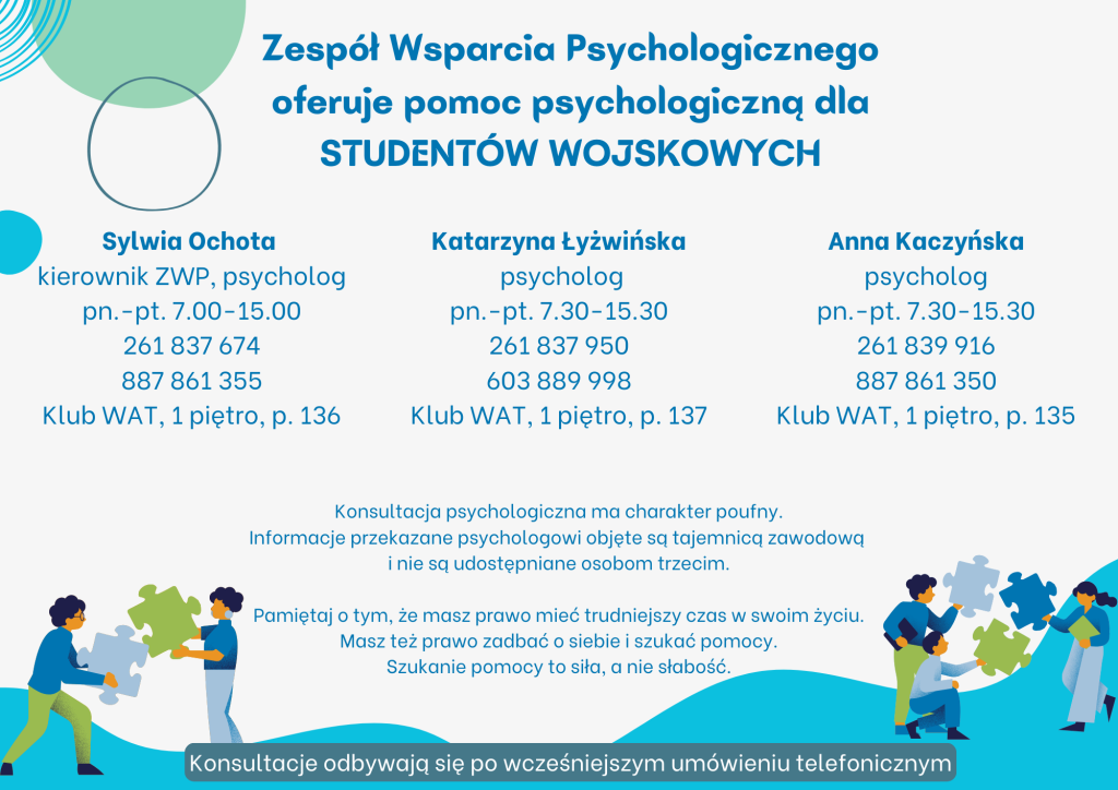 Więcej informacji: https://www.wojsko-polskie.pl/wat/zespol-wsparcia-psychologicznego/